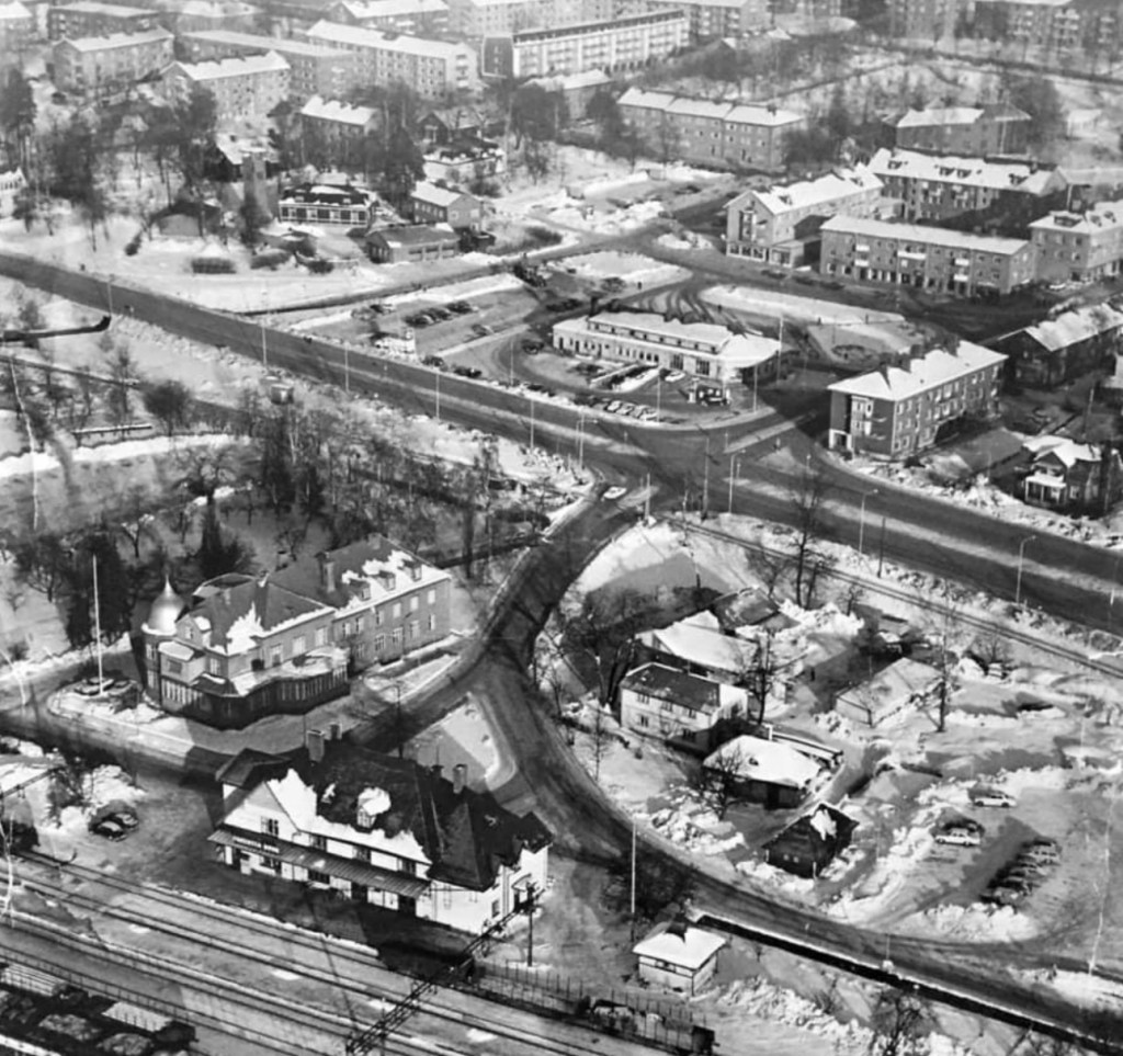 Närmast i bild ses Norra station intill hotellet och i mitten busstationen. I dag är bara stationshuset bevarat.