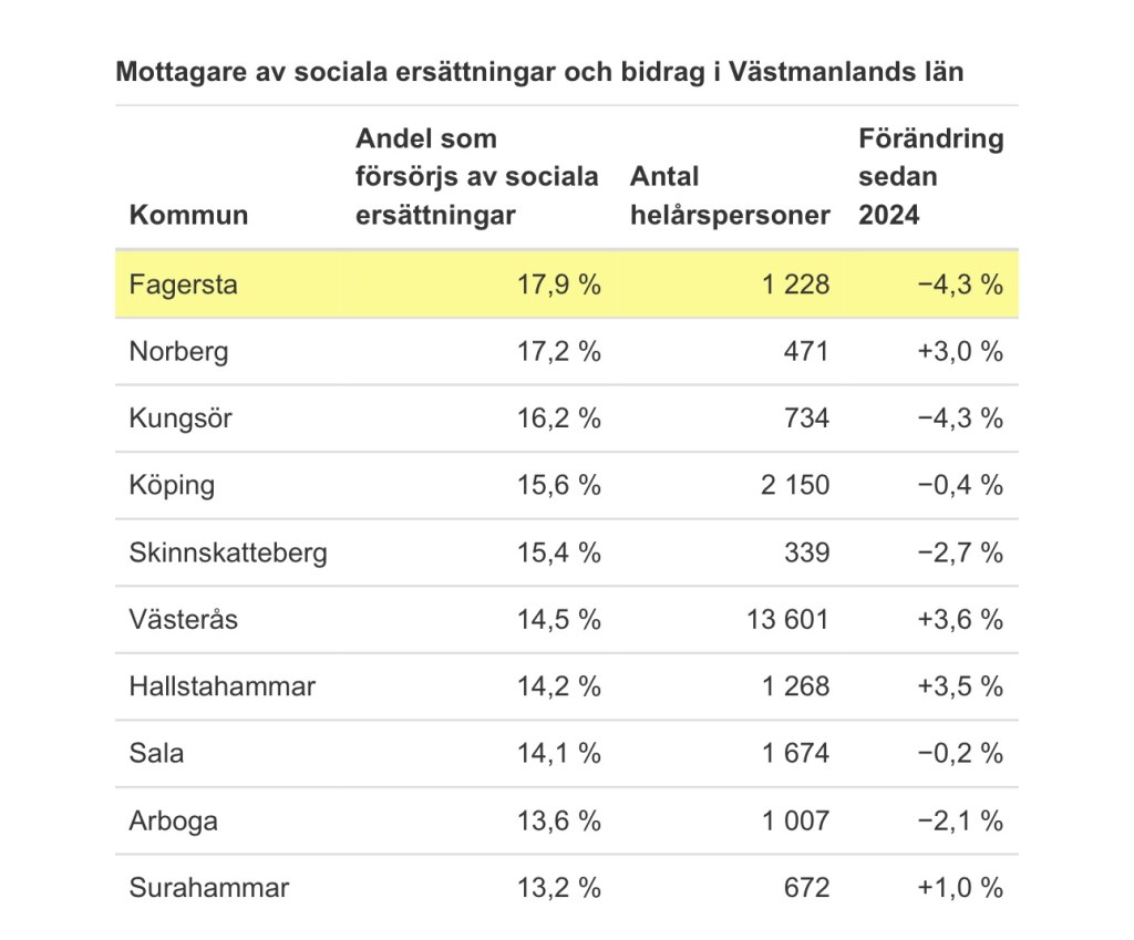 Fagersta är den kommun i länet som har störst andel invånare med någon form av ersättning eller bidrag. Lägst är andelen i Surahammars kommun, 13,2 procent.