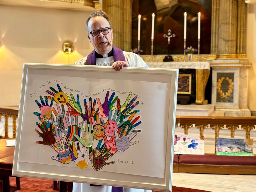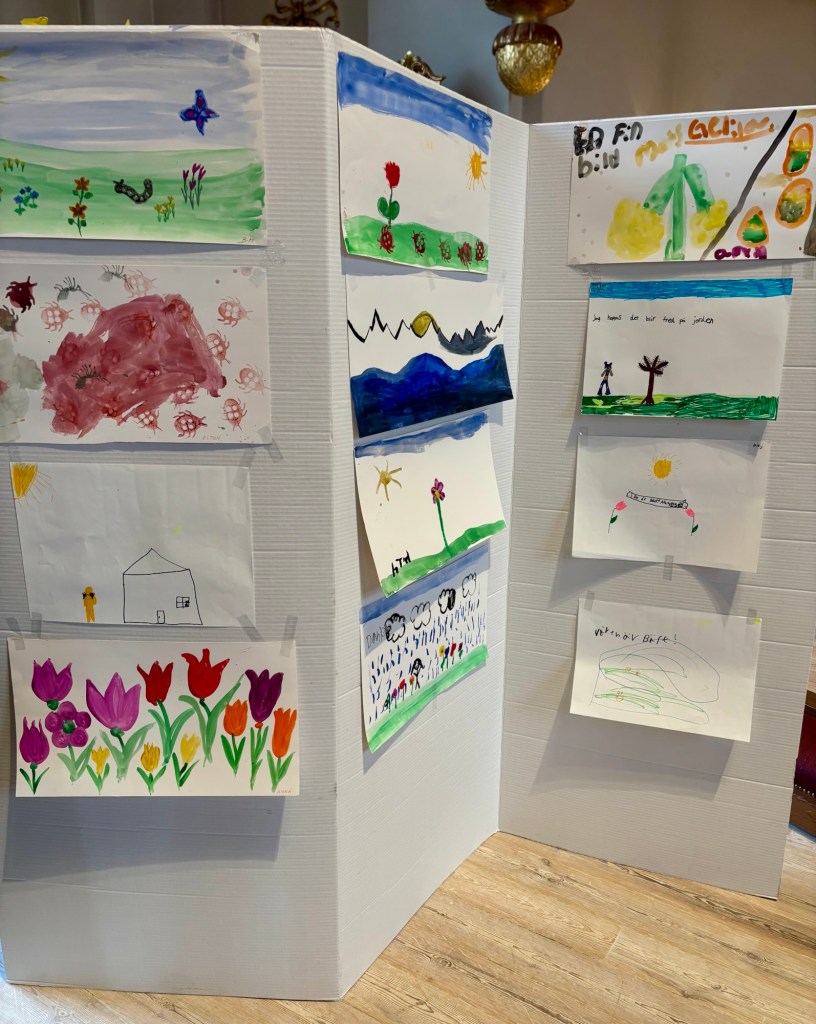 Det lyste klart inne i Västanfors kyrka i form av ljuvliga målningar skapade av församlingens barngrupper. Teckningarna blev en färgklick i den grå söndagsmorgonens dis.