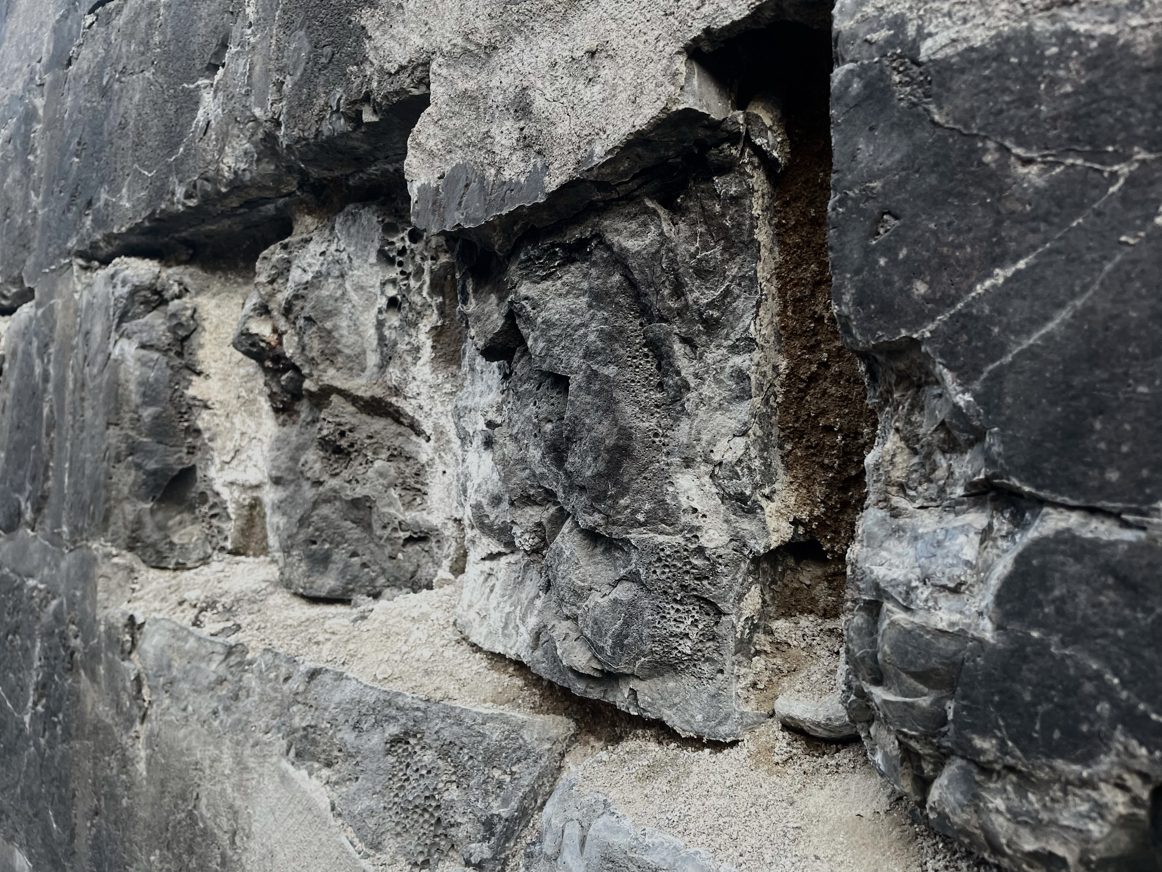 På torsdagskvällen hade två stenar släppt från ena väggen och hamnat ute i körbanan och på flera ställen finns det allt mindre fog som håller de gamla slaggstenarna kvar. Av den gamla fogen återstår bara sand där det är som värst.