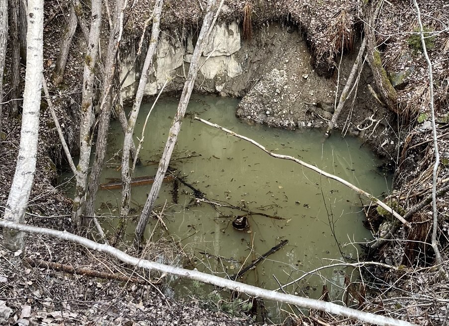 Ett av dem ligger helt nära en promenadstig som används vid skolutflykter och orientering. Det ser ut att vara 25-30 meter djupt och är delvis vattenfyllt. Det är obegripligt att detta relativt stora gruvhål inte inhägnats genom årens lopp.