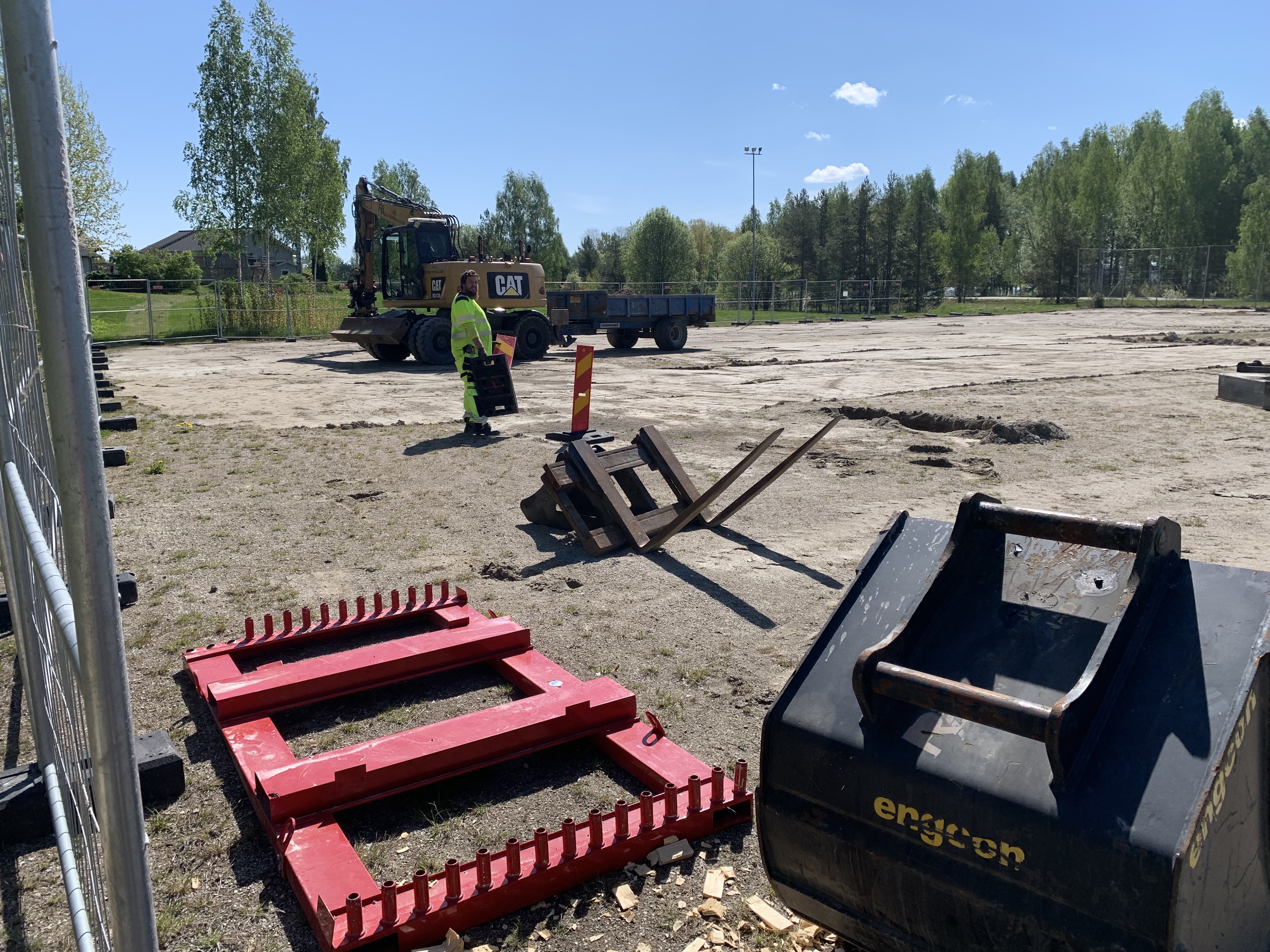 Grävmaskinisten Jimmy Andersson och kollegan Jonas Lagergren, RÅ entreprenad AB, förbereder nu inför multisportplanen, som kommer att innehålla redskap för bland annat fotboll och basket. Poängen är att aktiviteterna ska ske spontant utan inblandning av några föreningar.