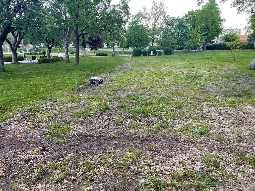 För att vara säker på att ha sett rätt stod redaktören kvar och väntade medan roboten vände. Jo, den körde återigen över ängsytan, den som SVT berättade om i februari 2020 skulle förgylla bilden av Vilhelminaparken, men i dag bara ser eländig ut.