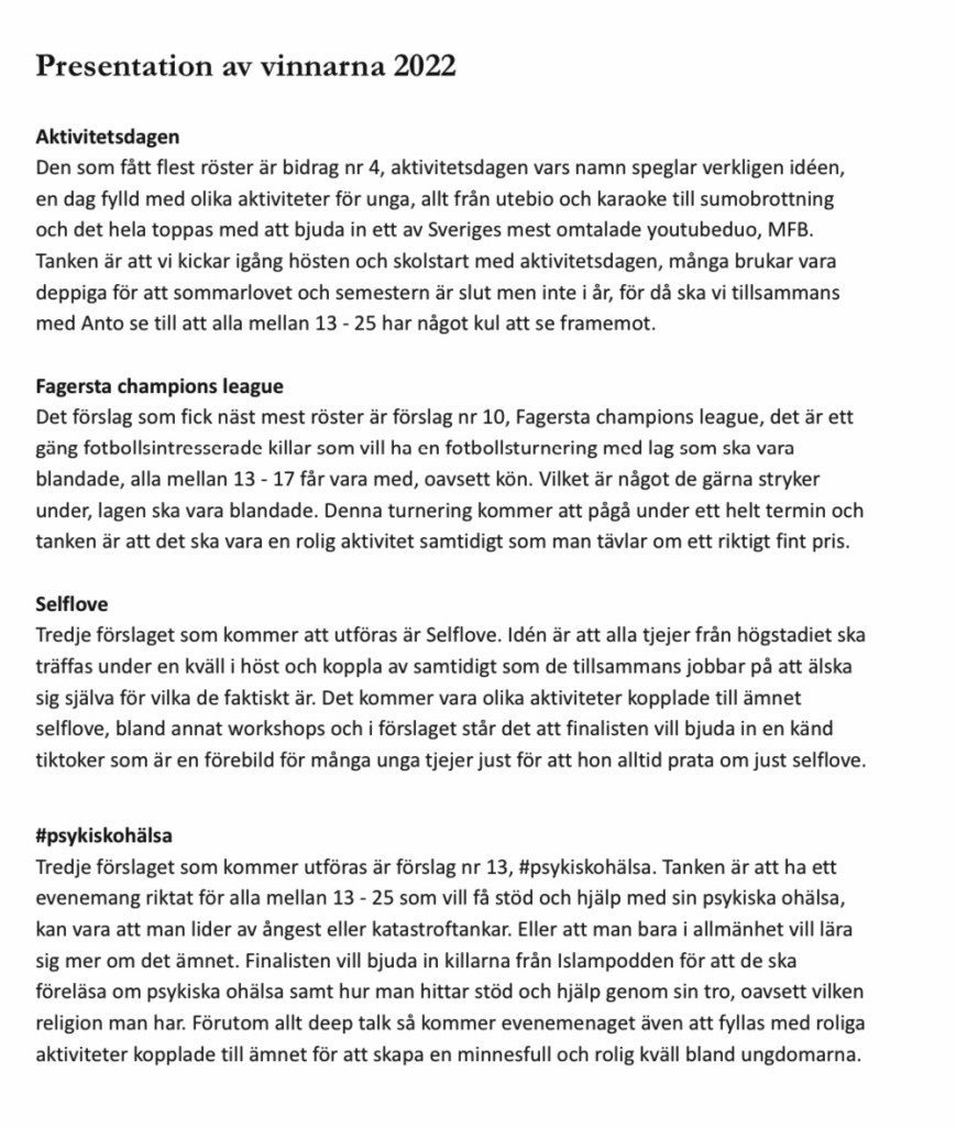 14 förslag hade kommit in från unga i Fagersta. De fyra förslag som fick flest röster av de cirka 300 som kom in får dela på 200 000 kronor som ska finansiera deras idéer och genomföras i år. Projektet har letts av Annika Hedberg Roth och Aya Elturk.