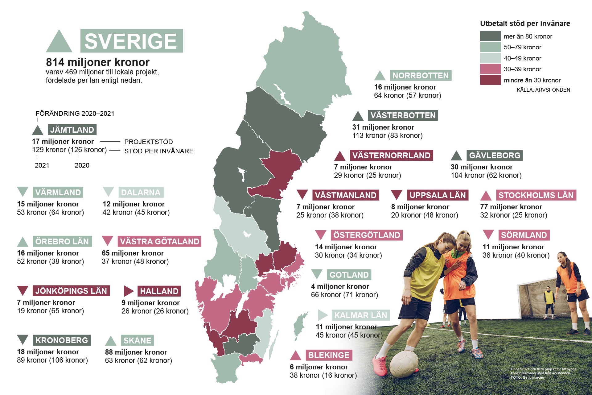 Samtidigt vet vi att det är stora skillnader mellan länen på hur mycket projektmedel som delas ut. Jämtland var det län som under 2021 fick mest stöd ur Allmänna arvsfonden med 129 kronor per invånare i länet. Det kan jämföras med Jönköpings län som fick 19 kronor per invånare. Under 2021 betalade fonden ut totalt 7 miljoner kronor till sex projekt i Västmanland.