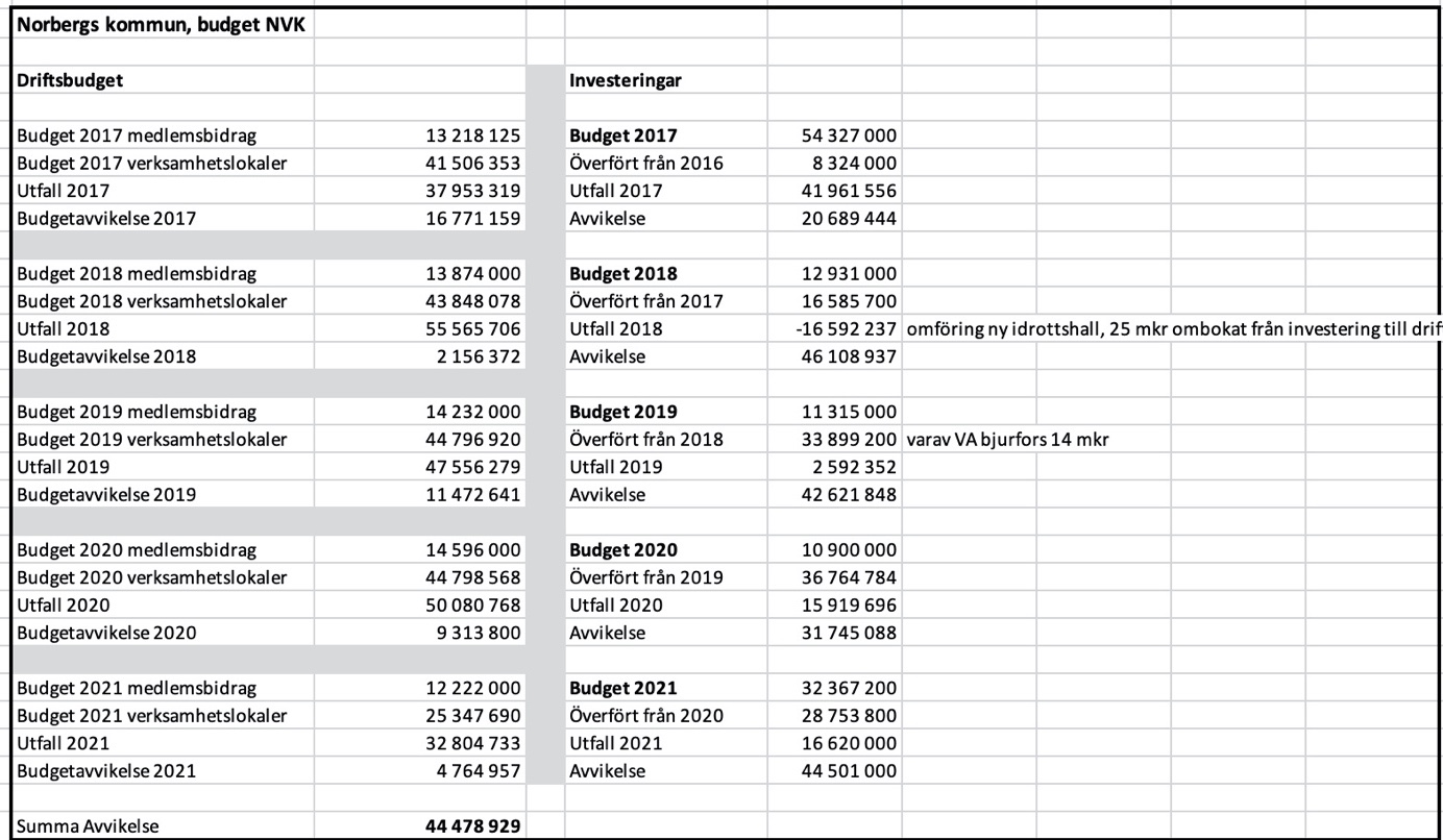 De 45 miljoner som Demokraterna ”hittat” utgörs enbart av avvikelser från NVK:s driftsbudget under åren 2017-2021. Ackumulerat uppgår de till 44,7 miljoner. Investeringarna som inte genomförts på 44,1 miljoner är något helt annat och belastar inte Norbergs kommuns resultat överhuvudtaget. Det är pengar som inte tagits i anspråk.