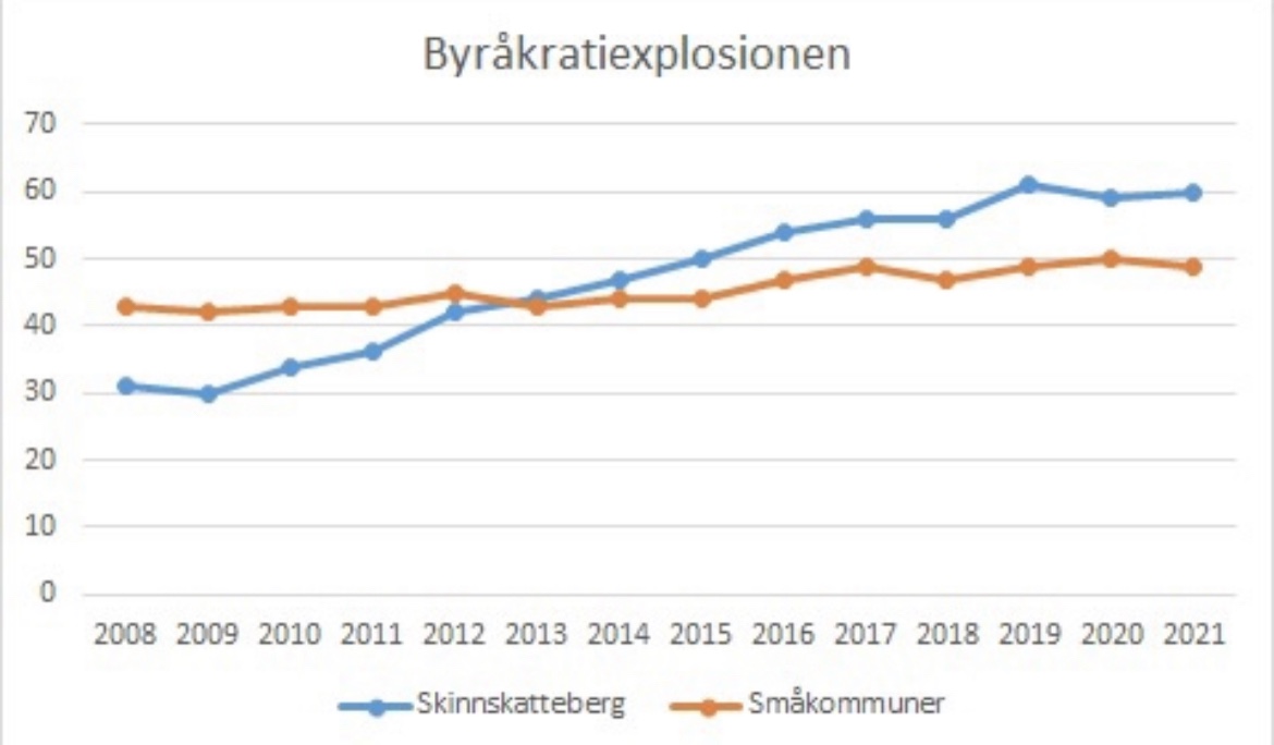 Under åren 2008-21 ökade antalet administrativ personal stadigt. Det praktiskt taget fördubblades. Ökningen i andra småkommuner var mer måttliga 14 procent. Från 2014 då de borgerliga tillsammans med SD tog över styret går Skinnskatteberg om jämförelsekommunerna. Sen har det fortsatt av bara farten. I undergrupper finns ännu häftigare siffror: Antalet handläggare har t ex under de här åren ökat med 300 procent.