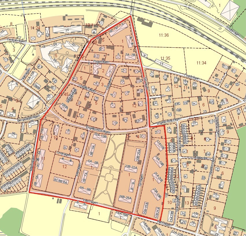 De fastigheter som berörs är inom färgat område på bilden nedan: