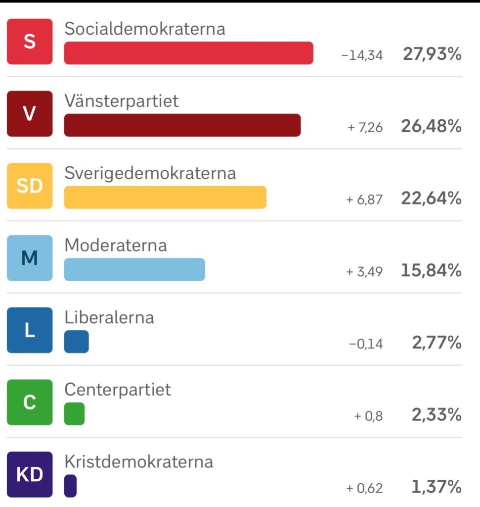 Vänsterns Hassan Chabbani fick flest röster med 243, tätt följd av Bertil Fredriksson, SD med 241. Tvåa på Vänsterns lista i personvalet efter Chabbani blev Linda Normann med 102 röster och trea Shiro Biranvand med 97. Andra plats i SD:s personval gick till Peter Lilja med 123 röster.