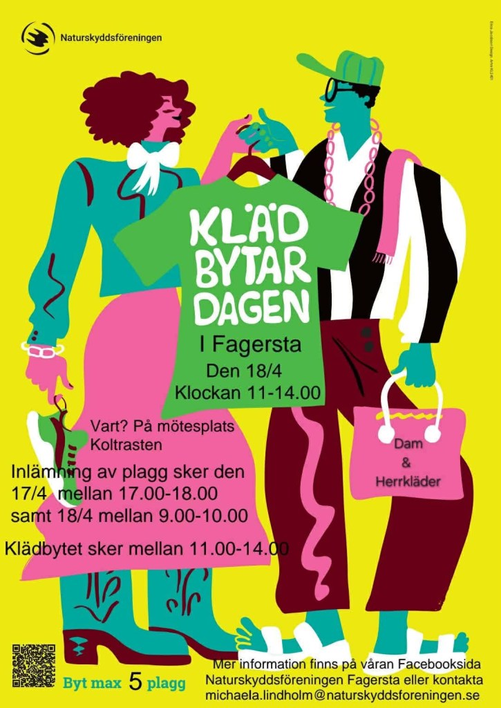 Den 18 april ordnar Naturskyddsföreningen klädbytardag i Fagersta på mötesplats Koltrasten. Låt dina kläder komma till användning hos någon annan! Att byta kläder med varandra är bra för både plånbok och miljö.